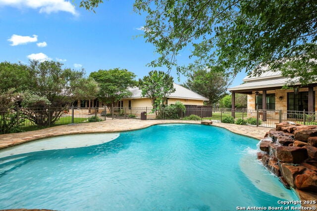 Experience the Charm and Elegance of this Stunning Santa Fe style estate in The Estates of Rockwall Ranch, offering over 4200 sq ft of living space in the Main house, 3+car garage on a beautifully wooded 2.14-acre lot, plus a 1463 sq ft Pool House with loft and 2 car garage. Designed for both relaxation and entertainment, this unique property includes a spacious 5-bedroom 4.5 bath main home with 2 guest rooms that are ensuites, other 2 bedrooms share a jack n jill layout and a detached pool house, all nestled behind the original Rockwall that once separated the land from an adjoining cattle ranch. 1093 sq ft 3-4 car garage adjoining the main house, 2 car garage adjoining the pool house. Step into the main house and be greeted by a warm, inviting open concept with 15 ft ceilings that seamlessly blends the living room, dining room and chef's kitchen. Perfect for both everyday living and hosting guests. High-end finishes with gorgeous chandeliers, lighting, flooring, Cabinetry, closet built ins, separate steam shower, and charming wooden shutters throughout several rooms that enhance the Southwestern Character of this home. 5 ton HVAC system replaced in 2020, 1.5 ton HVAC replaced in 2024. Water softener replaced in 2024, 3 tankless water heaters in main house and I electric WH in Pool house with separate HVAC system. Outdoor living is elevated to a new level with a stunning backyard Oasis. A custom pool with a cascading waterfall surrounded by a spacious deck perfect for lounging, dining, and entertaining. The outdoor BBQ pit makes summer barbecues a breeze, enjoy a cold or hot beverage gathered around the large Firepit with custom rocks brought in from Arizona, the Official size Sports court currently used for Basketball but could easily be made into a great pickleball or tennis courts, with lighting for evening play and batting cage offer fun and fitness for all ages. Don't miss the opportunity to own this one-of-a-kind Southwestern Style retreat!