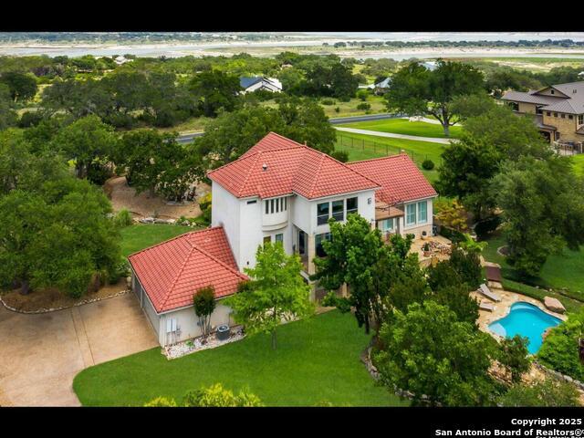 Welcome to this stunning 4 bedroom, 3.5 bath, 3 CG home. This resort style home will not disappoint! It's great for entertaining, boasts a refreshing, lagoon type pool, awesome waterfalls, ponds & water features front & back, gazebo, large covered patio w/sun shades, lush landscaping, outdoor lighting, owners suite balcony to enjoy beautiful sunsets & the beauty of the TX Hill Country. Home sits on 1.37 acres in the prestigious gated Peninsula at Mystic Shores just minutes from Canyon Lake. Gourmet kitchen has a 6 burner Kitchen Aid gas cook top plus a 2 burner smooth top on the island. Downstairs has two nice size bedrooms & 2 full baths with walk-out patios. Home has a whole house vacuum, 2 fireplaces, ceiling fans throughout, whole house intercom system with indoor/outdoor speakers, full sprinkler system, wrought iron fencing around entire property replaced 2024, locked pedestrian wrought iron gate & a power driveway gate, 3 recent AC units, pool resurfaced 2024, new appliances Dec 2023, private well with 10,000 gallon storage tanks with new control pumps 2024 & so much more. Mystic Shores & it's 32 acre has amazing amenities to include a large pool, tennis, pickle ball & basketball courts, volleyball, walking trails, pavilion, picnic areas, etc. Mystic Shores has many special events, regular food trucks, special groups & activities for homeowners to participate in. Don't miss out owning a home in the Peninsula at Mystic Shores & please schedule your private viewing for this exquisite home!