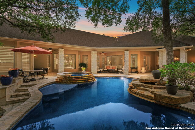 Welcome to your private retreat nestled in the highly sought-after Wild Wind neighborhood of Garden Ridge. This spacious 4 bedroom, 4 bathroom home offers a thoughtfully designed layout with one bedroom located on the second floor perfect for privacy or flexibility. The primary suite is a true sanctuary with large walk in shower, separate jet tub, workout room, and an oversized walk in closet. Set on nearly an acre and surrounded by mature trees, the beautifully landscaped lot boasts a sparkling pool and hot tub, covered patios with an outdoor kitchen. The oversized 3 car garage offers plenty of room for vehicles, tools, and hobbies. Schedule your appointment today and view a true gem.