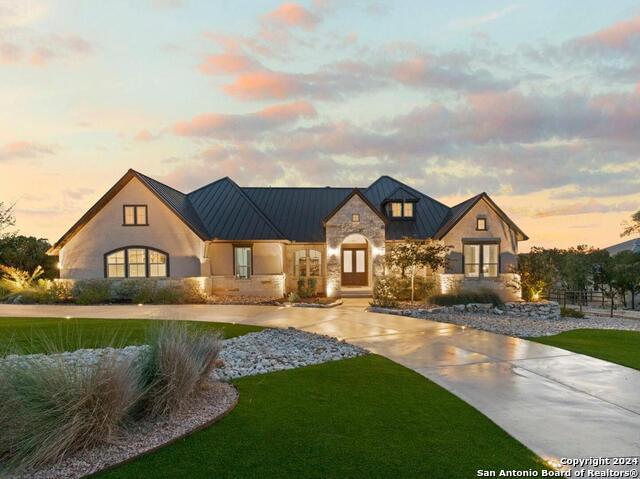 One of a Kind Hill Country Masterpiece tucked inside the exclusive gates of Copper Ridge, New Braunfels' premier community. Perfectly positioned on a private 1.1-acre cul-de-sac lot, this breathtaking estate blends timeless elegance with everyday comfort, offering unrivaled panoramic views and a backyard resort-style oasis. From the moment you enter, you're drawn to the expansive hilltop scenery and refined architectural details-Savannah Hickory hardwood flooring, hand-selected accent tile, soaring ceilings with wood beams, and a floorplan designed to impress and embrace. The chef's kitchen is pure luxury, featuring Diamond Bianco granite countertops, double-stacked custom cabinetry with glass-front accents, a 36" Cafe gas cooktop, double ovens, and an Italian white apron sink. Whether you're hosting a lavish dinner party or enjoying a quiet evening at home, this space effortlessly combines functionality and style. The main level includes four serene bedrooms, a light-filled sunroom, a dedicated study, and a flexible bonus room-thoughtfully laid out to offer both privacy and connection. The upstairs level is reserved for a private casita-style retreat, complete with a game room wired for surround sound, media room, office, and half bath. With no bedrooms on the second floor, it's the ideal space for multigenerational living, a guest retreat, or a quiet creative escape.The primary suite is a sanctuary unto itself, offering sweeping views and a spa-worthy bathroom with a 71" cast iron soaking tub, a rain shower with body sprayers, and dual designer closets that provide both space and sophistication. Step outside to discover your paradise. A heated pool and spa with a cascading waterfall grotto invite you to unwind, while the large covered patio with a stone fireplace creates the perfect setting for year-round entertaining. The outdoor kitchen is fully equipped with premium stainless steel appliances, granite countertops, and a deep single-bowl sink. Professionally designed landscaping incorporates native Texas rock, lush greenery, and premium artificial turf for a manicured look with minimal maintenance. This home is as smart as it is stunning, with energy-efficient solar panels, a painted standing seam metal roof, a grand circular drive, and a 3-car garage. The backyard is enclosed with 535 linear feet of sleek steel fencing, overlooking scenic ranch land. Two tankless water heaters, a whole-house water filtration system, and a water softener complete the list of thoughtful upgrades. Located just 10 miles from historic downtown New Braunfels and under 35 miles to the San Antonio International Airport, you'll enjoy both convenience and tranquility. Copper Ridge offers 24-hour manned gate security and upscale community amenities, ensuring peace of mind and a sense of belonging. It's a lifestyle rarely found and impossible to forget.
