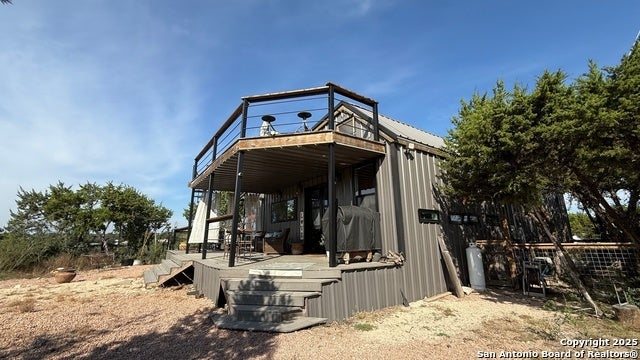 This custom-built fully furnished Lodge is designed for comfort, entertainment, and breathtaking Hill Country living. The spacious family room features a large flat-screen TV, cozy ceiling accents in warm tan, and sunset views that can be enjoyed from the bar seating for four or from a perfect spot affectionately called "La Bella." The open-concept kitchen is a chef's dream, boasting a large island, gas stove, new fridge with ice maker, dishwasher, walk-in pantry, and a sitting area with sunset views-perfect for morning coffee or evening gatherings. A dedicated pool table room with two additional TVs adds to the home's entertainment appeal. The master suite is oversized, with a California King bed, private sitting area, luxurious bath with double vanity, walk-in shower, and expansive closet. Additional storage is abundant, and the home includes a utility room with a newer stackable washer and dryer and a half bath for convenience. Step outside to enjoy a 1,000 sq. ft. deck and observation deck, offering both sunrise and sunset views with a zero-scape yard. Outdoor features include floodlights, deck lighting, ample seating, and plenty of parking. Additional amenities include central AC, a water filtration system, a drinking water system at the kitchen, rain water collection system and a sonic ice maker-every detail designed for comfort and functionality.